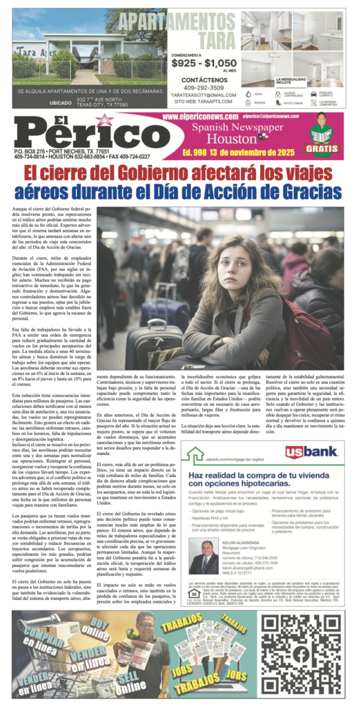 EL PERICO EDICION #998 Posted by Mauricio Hidalgo | Nov 12, 2025 | Uncategorized | 0 | Periodico de Texas, dirigido a la comunidad Latina como puente que une a la comunidad hispana con los acontecimientos sociales, políticos, económicos y culturales de Estados Unidos y Latinoamérica.