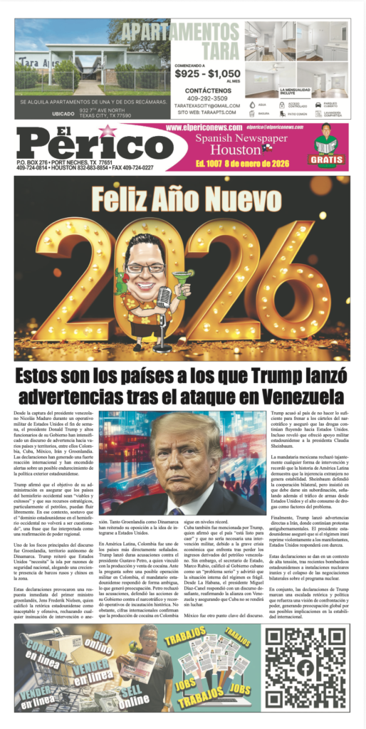 EL PERICO EDICION #1007 Posted by Mauricio Hidalgo | Jan 8, 2026 | Uncategorized | 0 | Periodico de Texas, dirigido a la comunidad Latina como puente que une a la comunidad hispana con los acontecimientos sociales, políticos, económicos y culturales de Estados Unidos y Latinoamérica.
