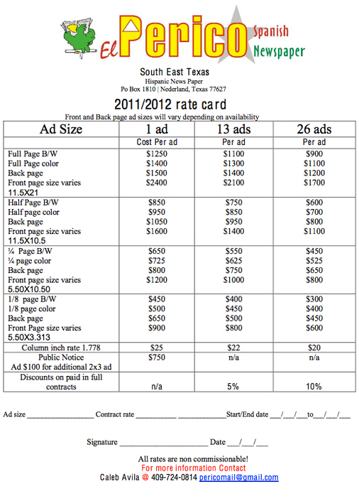 RATES & TERMS: Rates are net to the publisher and are guaranteed for the term of your insertion order. Cancellation of any portion of a contract voids all rate and position protection and ads ran will be re-invoiced at the above rates based on the number of ads ran. (example: sign contract for 20 ads for ¼ black and white contract rate is $250 per issue, cancel after running 6 times you will be invoiced at $400 per issue) 30 day written notice is required for all cancellations. 15-30 day payment terms shall only be provided to clients with approved credit application. 5% cash discount on all contracts over 13 issues paid in full and 10% discount on annual contacts paid in full.